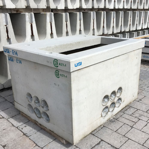 Installation requirements of precast concrete transformer vaults and associated conduit and cables.